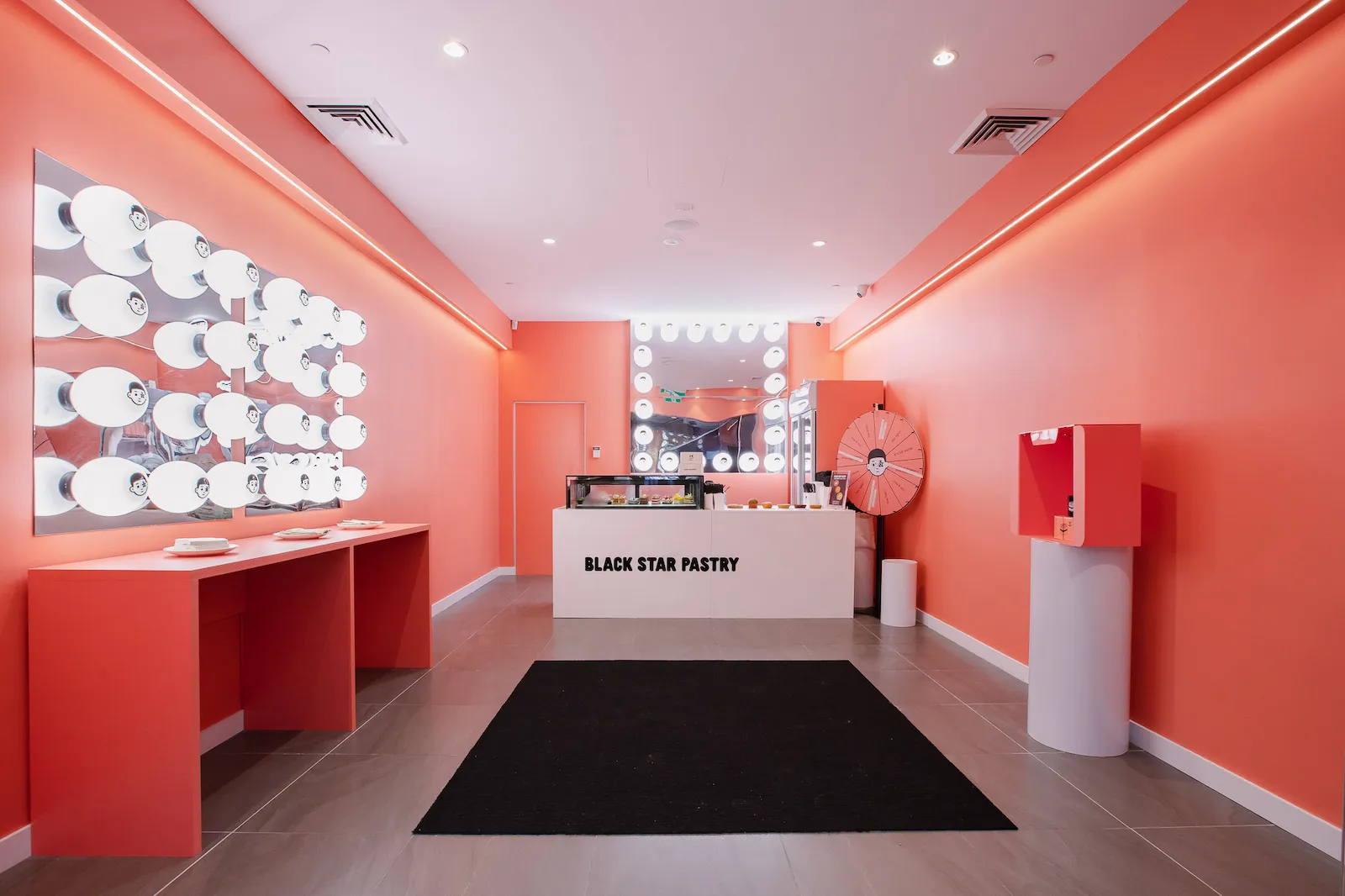 Featuring signature watermelon-pink walls inspired by the iconic Strawberry Watermelon Cake, custom Star Boy lighting, a bespoke display counter, and an interactive spin-wheel game, the Westfield Hurstville store delivers an eye-catching, playful brand experience that attracts strong foot traffic, encourages customer interaction, and reinforces Black Star Pastry’s distinctive identity.