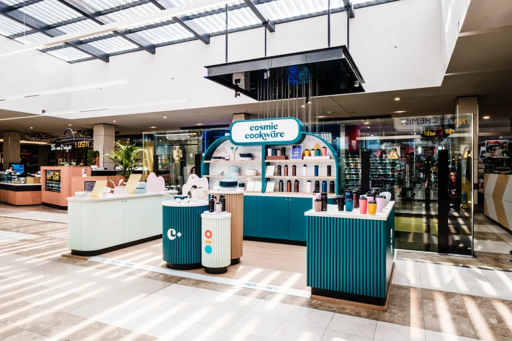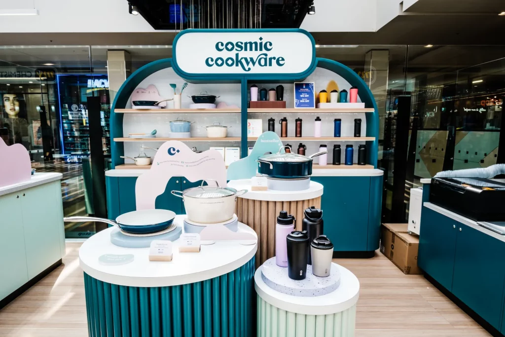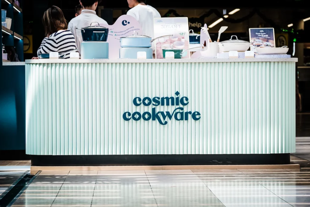 Cosmic Cookware was after a vibrant retail pop-up introducing its cookware range to shoppers in a busy retail environment. The space needed to showcase products in a visually engaging way while reflecting the brand’s colourful identity. It also had to support retail sales, product demonstrations and an interactive bottle name-engraving giveaway within a compact pop-up footprint.