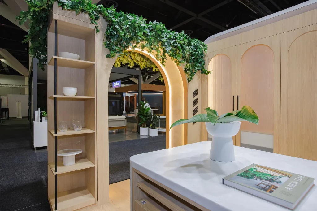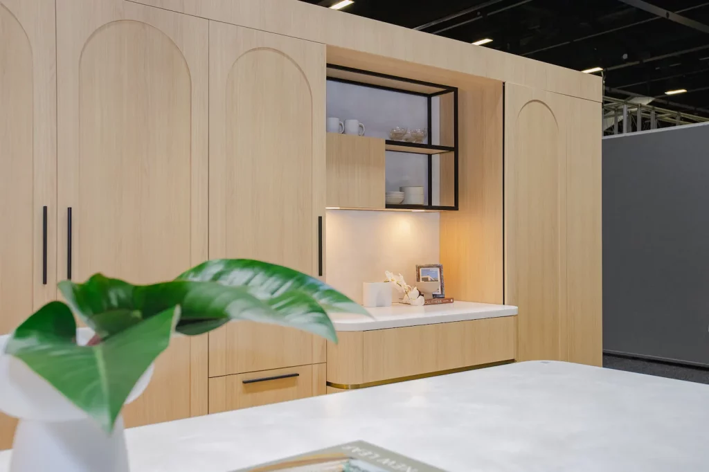 In collaboration with Hettich and Zephyr and Stone, Colab Design Group managed the full production, flooring, graphics, signage, installation and project management to bring the stand to life. The design featured warm light oak cabinetry, integrated storage solutions and architectural detailing, centred around a softly illuminated archway framed with greenery that welcomed visitors into the space. An illuminated overhead Hettich logo ensured strong visibility across the exhibition hall, while custom joinery, open shelving and integrated lighting highlighted the brand’s innovative hardware systems.