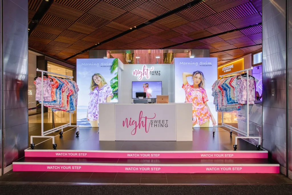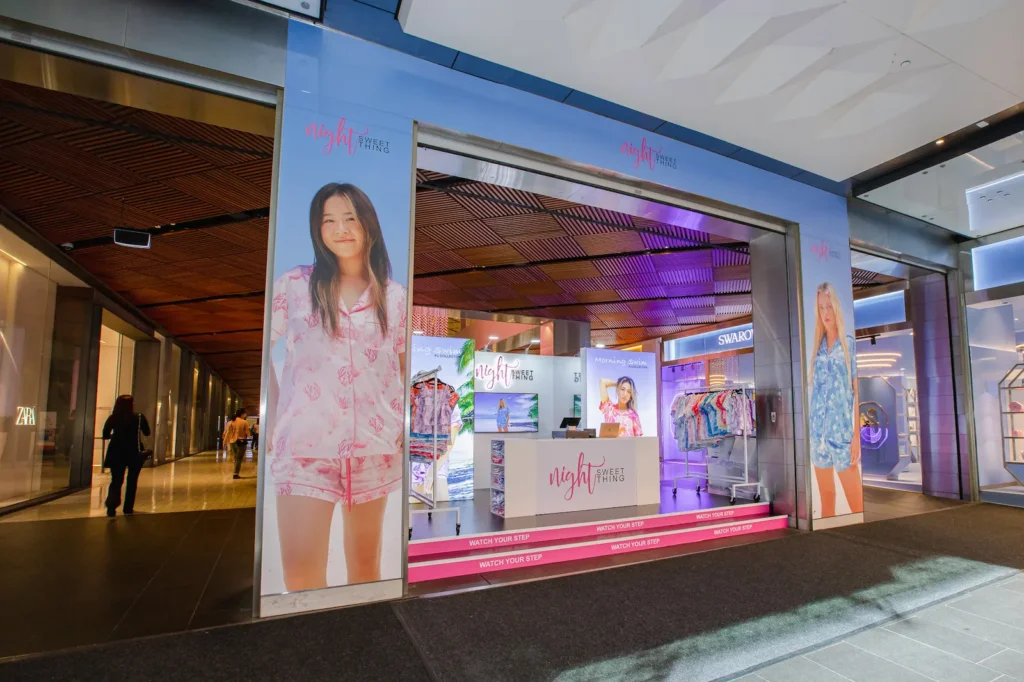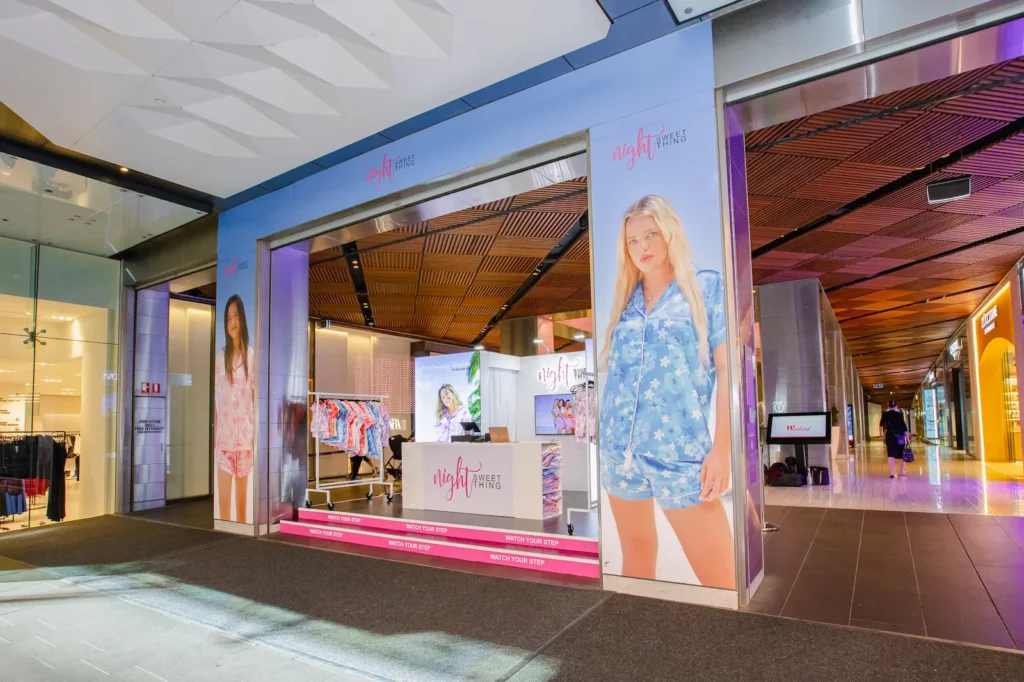 Influencer Bridey Drake’s sleepwear brand Night Sweet Thing needed a high-impact retail activation in the heart of Westfield Pitt Street – a space that could cut through heavy foot traffic, showcase the brand’s bold new collection, and deliver an immersive, try-on experience while working within a complex site layout.