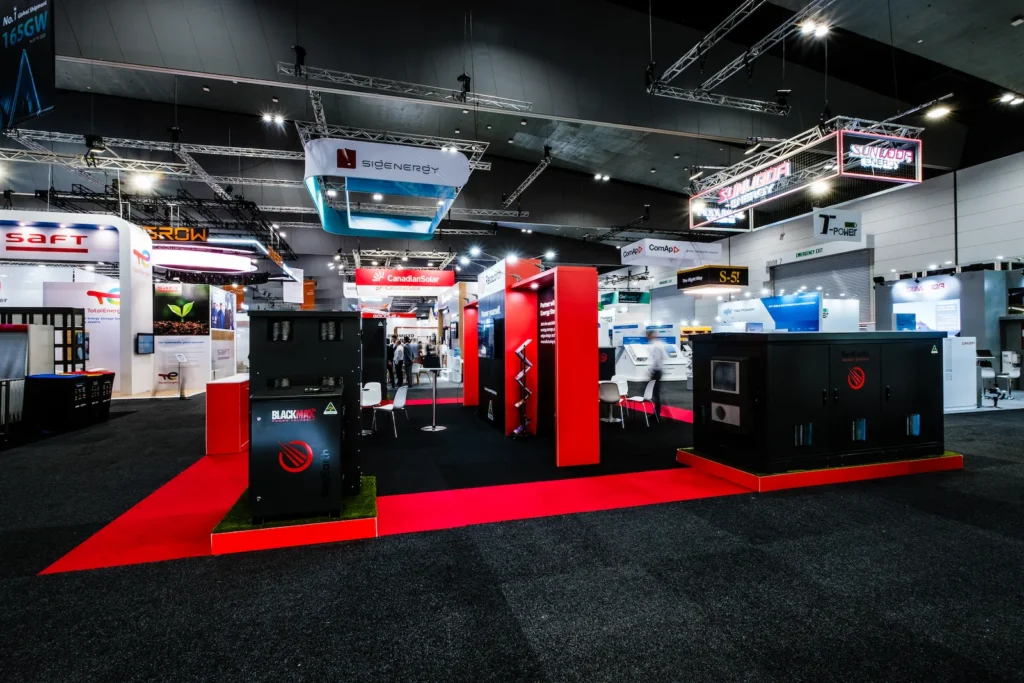 Colab Design Group designed and delivered a custom stand that combined strong brand presence with an open, accessible layout. RedEarth battery units were displayed on dedicated platforms to allow visitors to view the systems up close, while large branded walls with integrated TV screens showcased video content demonstrating real-world installations and applications.