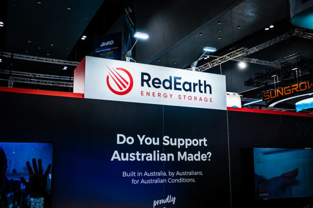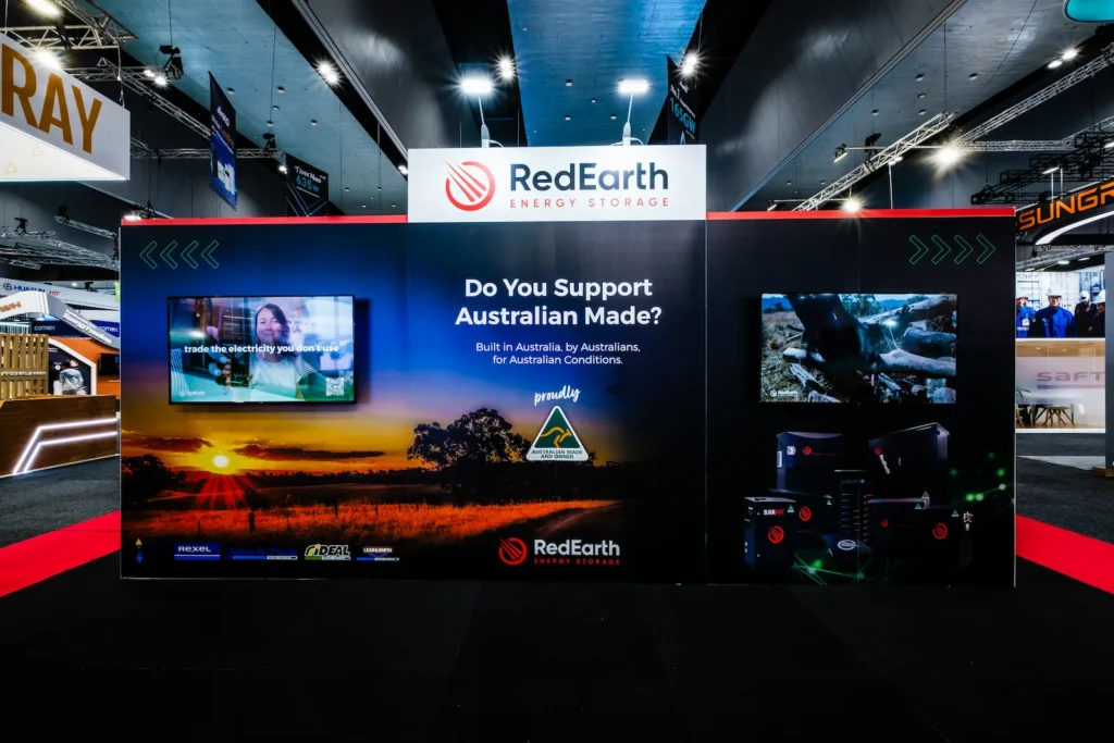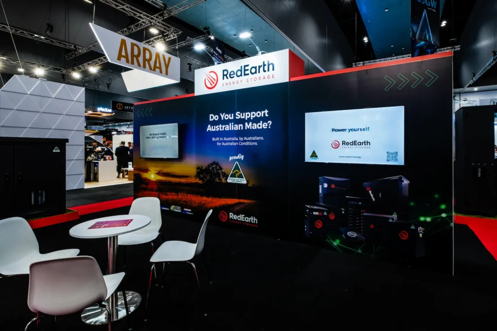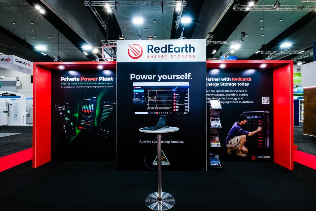 RedEarth Energy Storage, an Australian-owned solar battery manufacturer, required a custom stand at All-Energy Australia to showcase its energy storage systems and demonstrate how they can be used across residential and commercial applications.Within a 9m × 9m footprint, the stand needed to support live product demonstrations, digital content explaining the technology, and dedicated meeting areas for discussions with partners and customers.