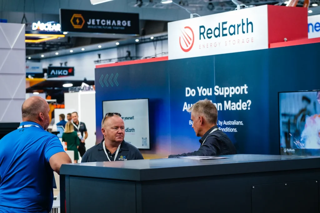 Bold architectural framing and contrasting flooring zones helped guide visitors through the space, while meeting tables and seating areas created a welcoming environment for discussions with the RedEarth team. The result was a highly engaging stand that effectively showcased RedEarth’s Australian-made energy storage solutions and encouraged meaningful conversations with industry professionals at All-Energy Australia.